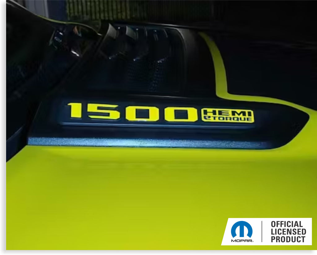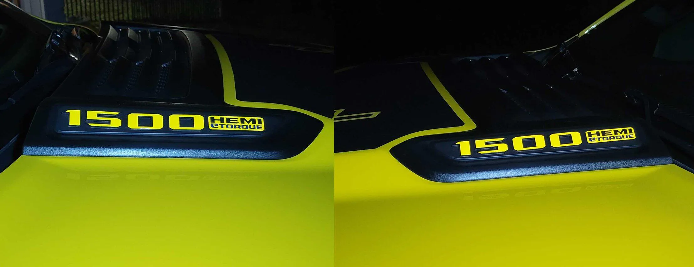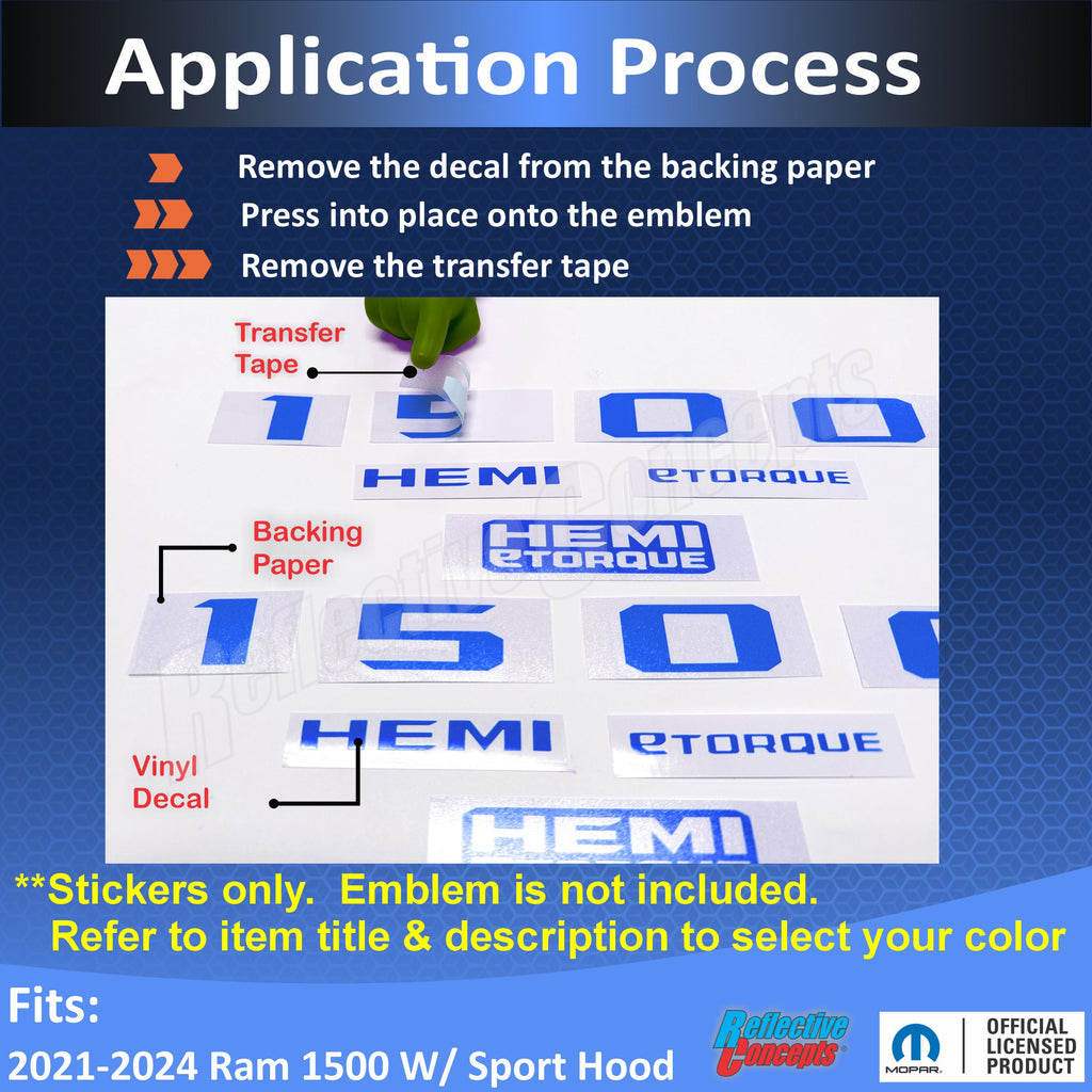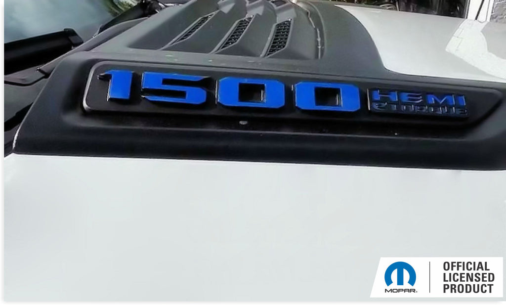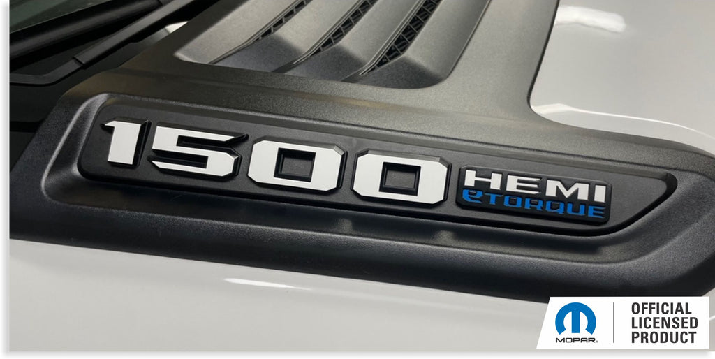 Vinyl decals sized and designed to overlay the 1500 Hemi eTORQUE hood emblems.