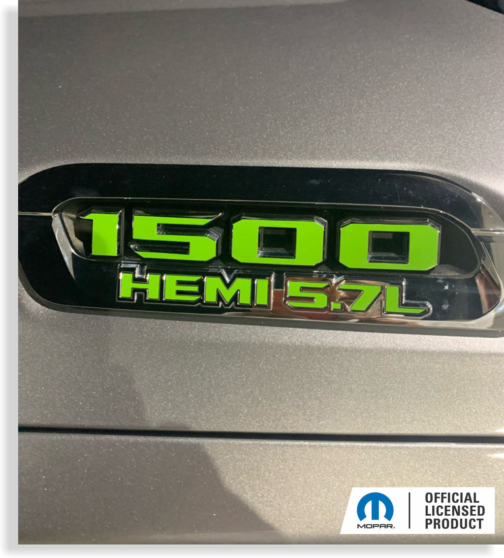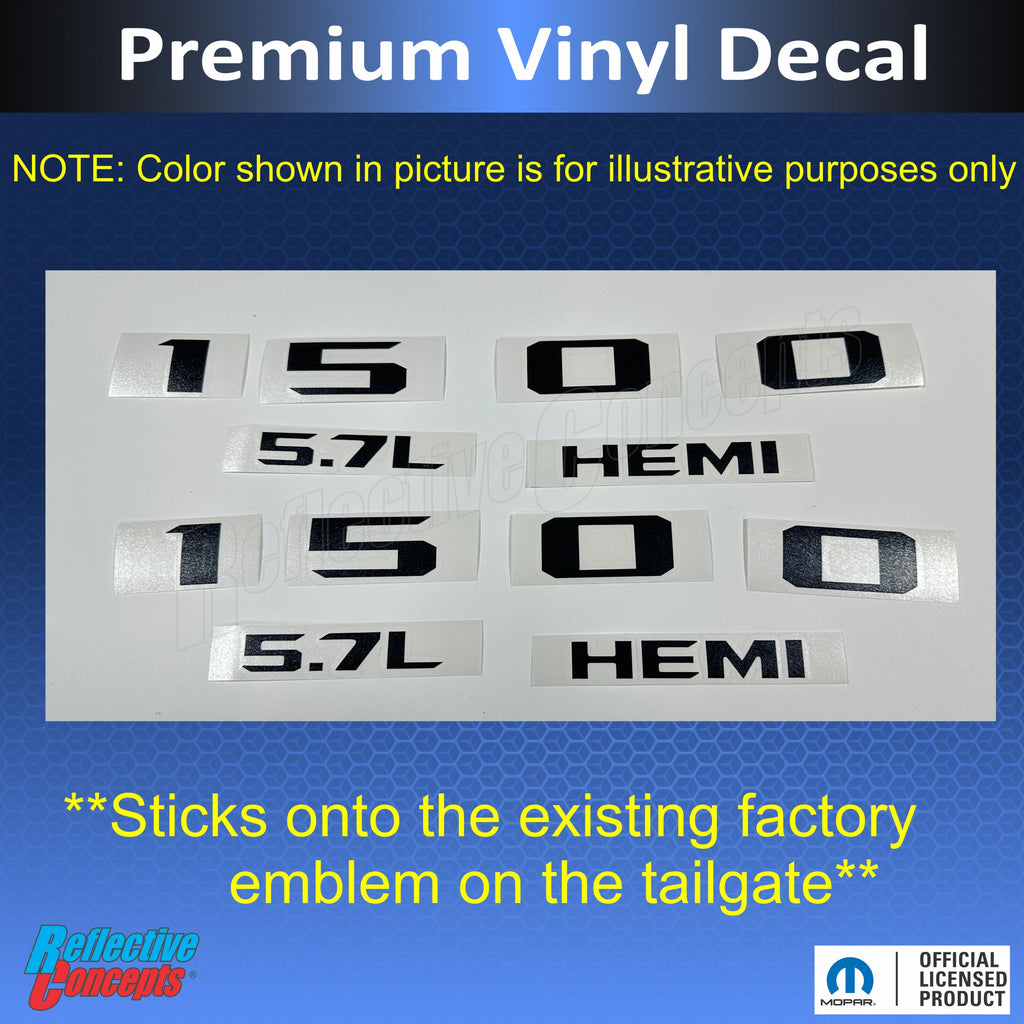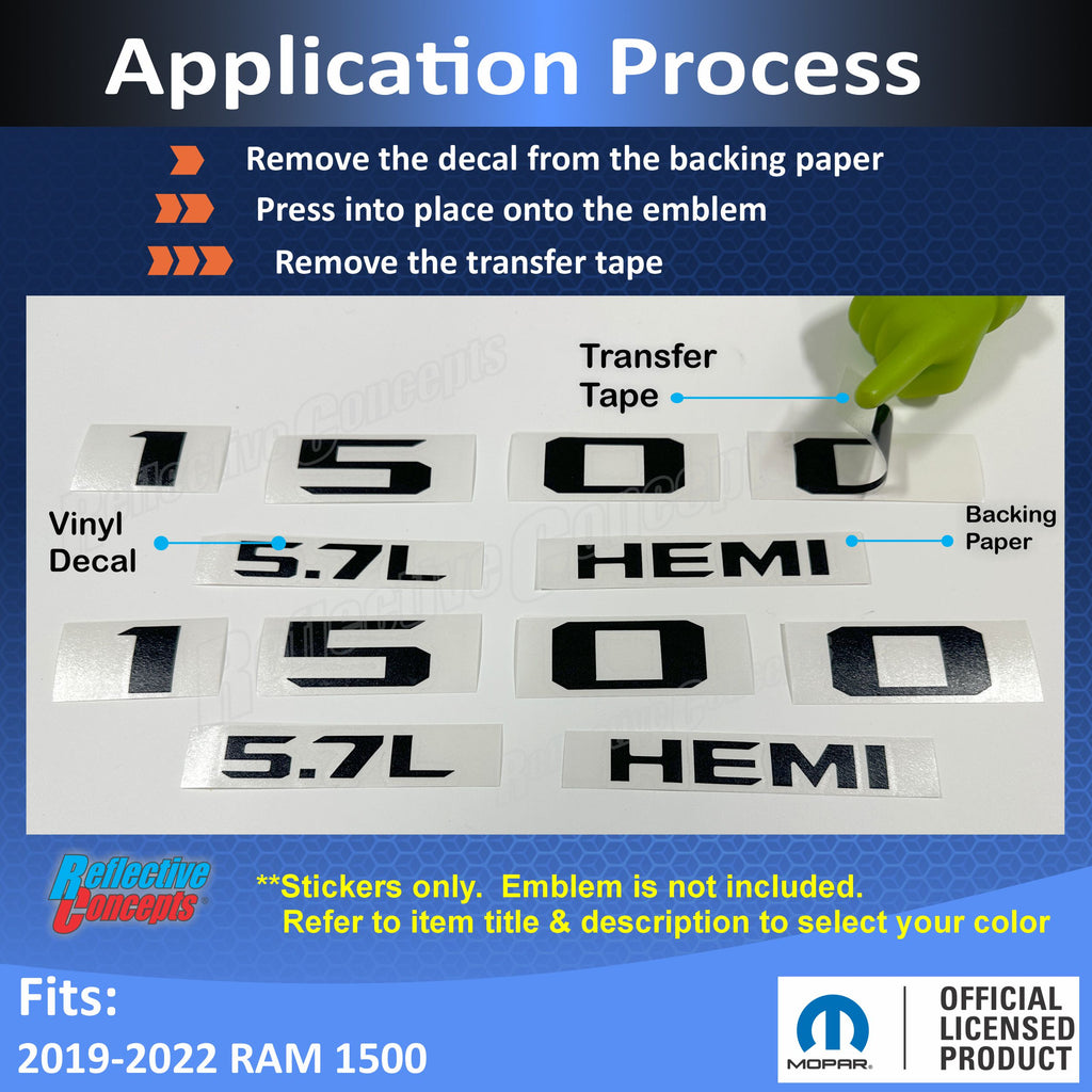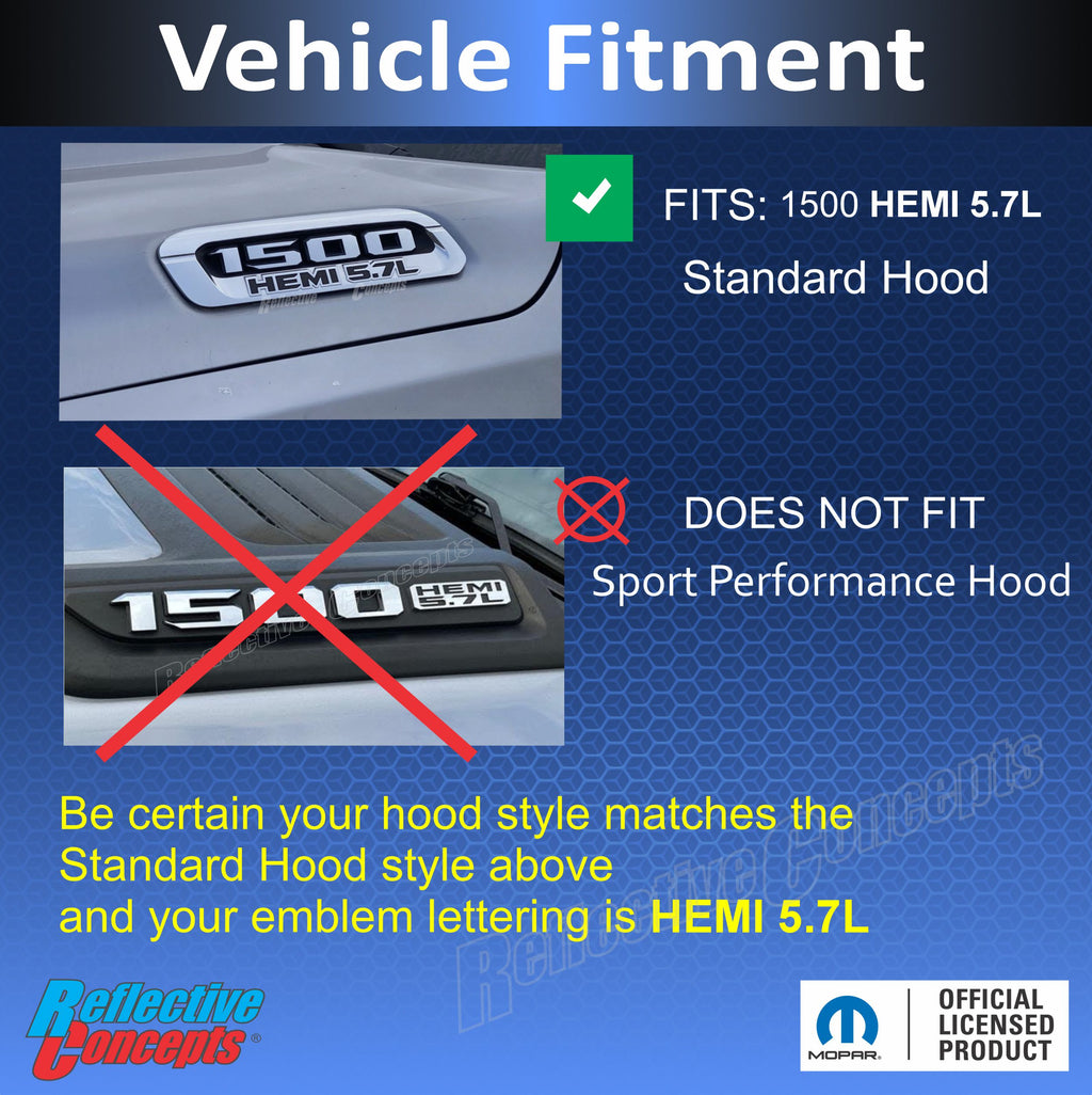 Vinyl decal sized and designed for the hood emblems. Overlays the face of the 1500 and over the black section of the HEMI 5.7L emblems on the hood.