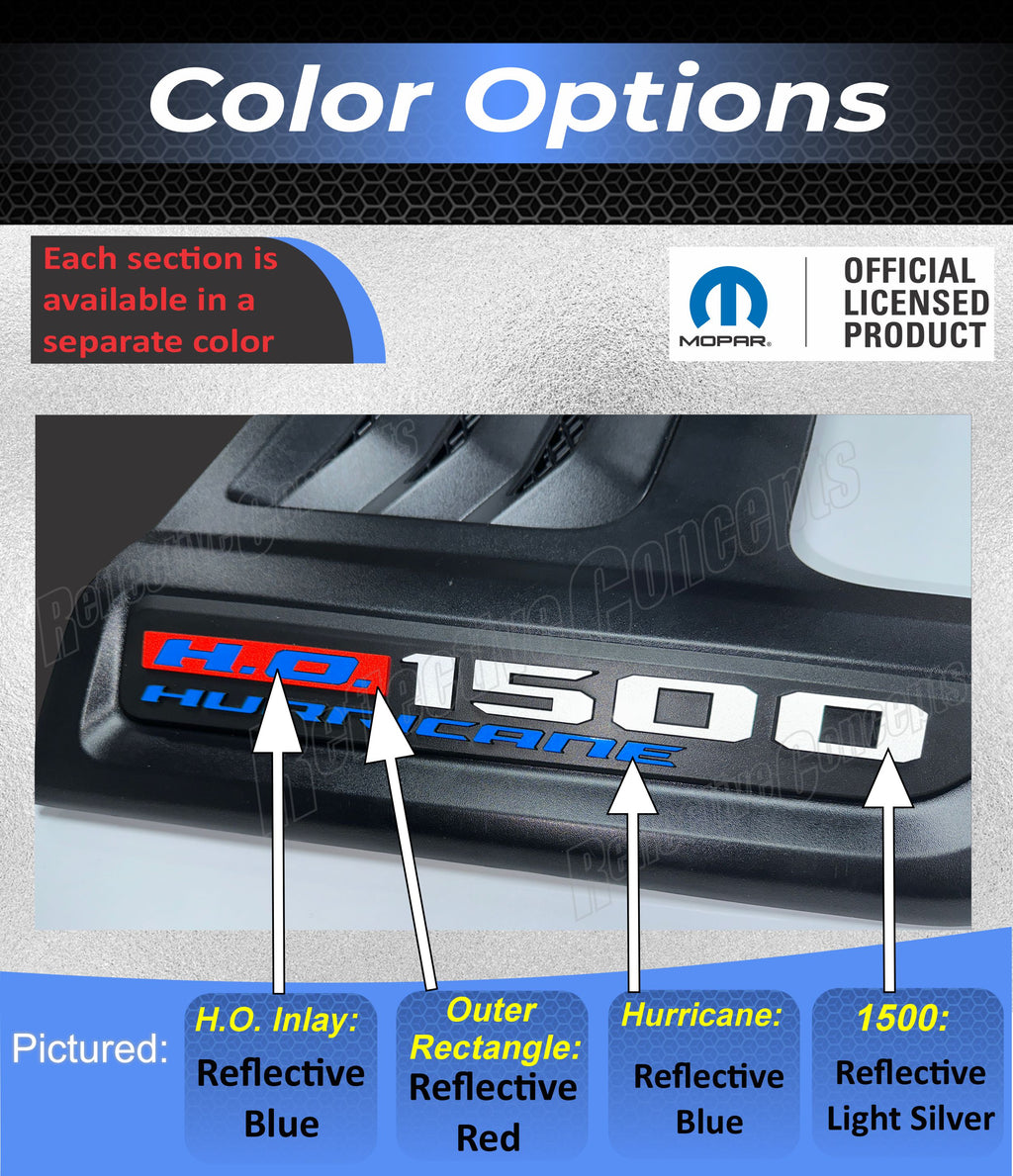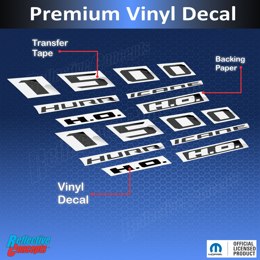 Vinyl decal stickers sized and designed for the 1500 Hurricane High Output Sport Performance Hood emblem.