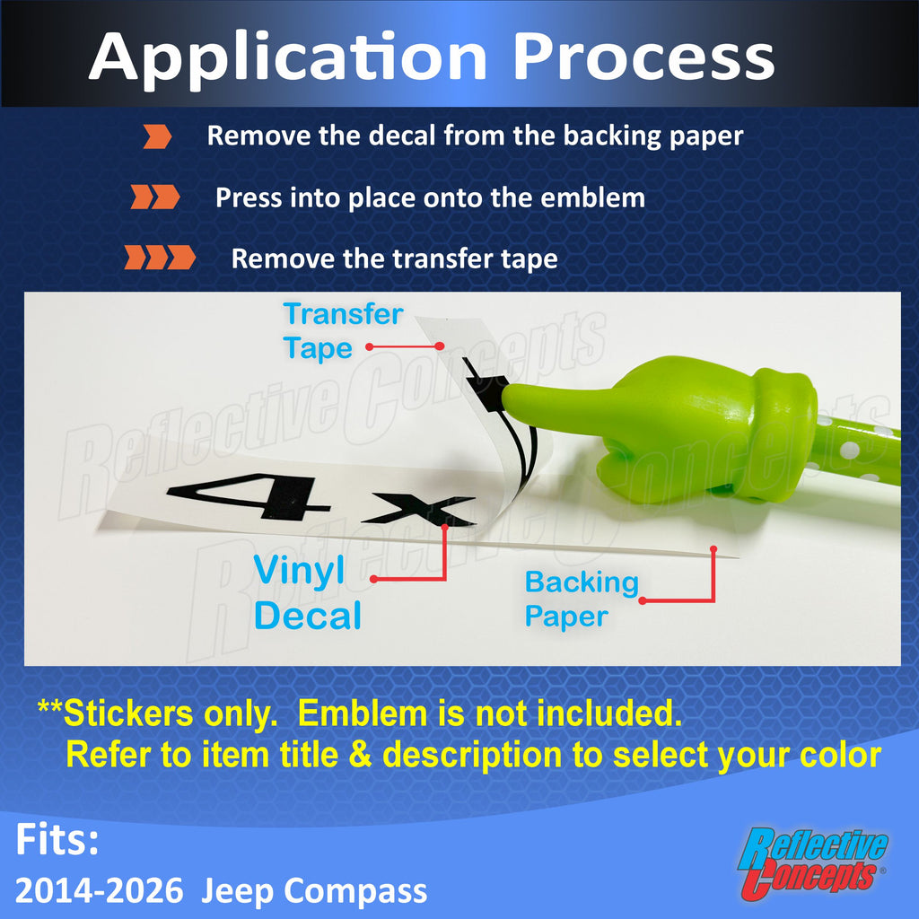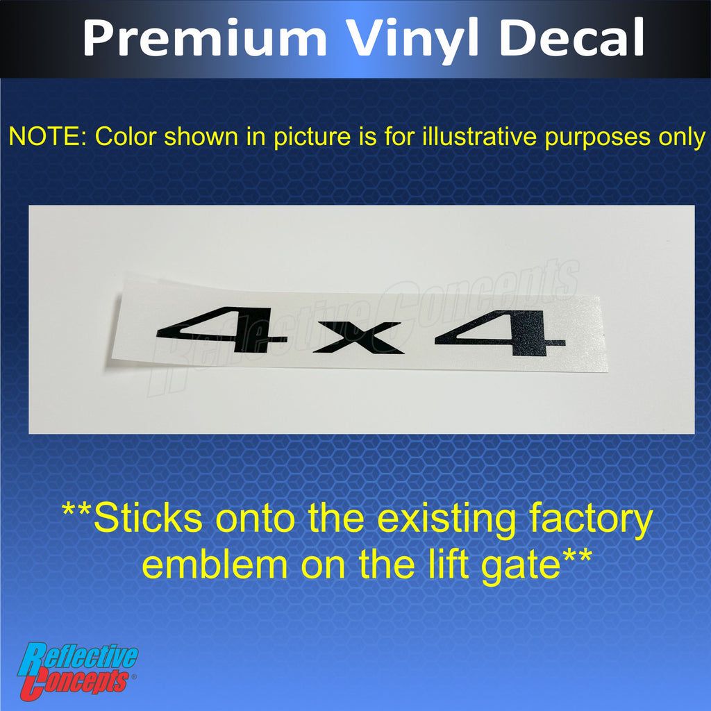 Vinyl decal sized and designed to overlay the flat front face of the 4X4 emblem on the liftgate. The outer edges of the emblem remain exposed (as pictured).