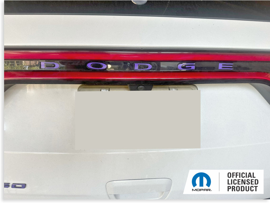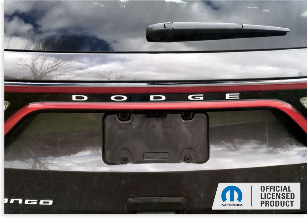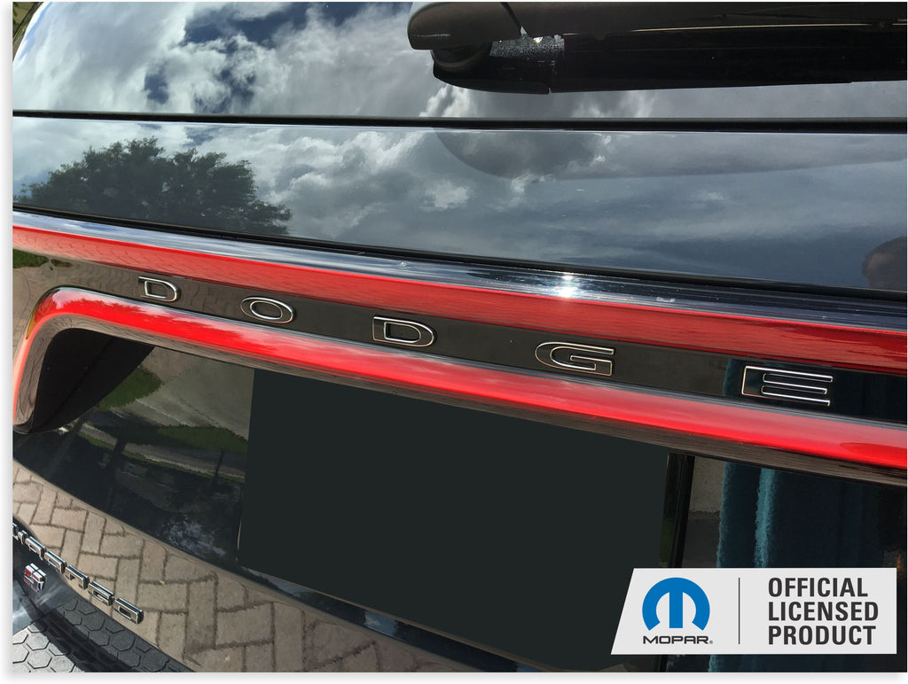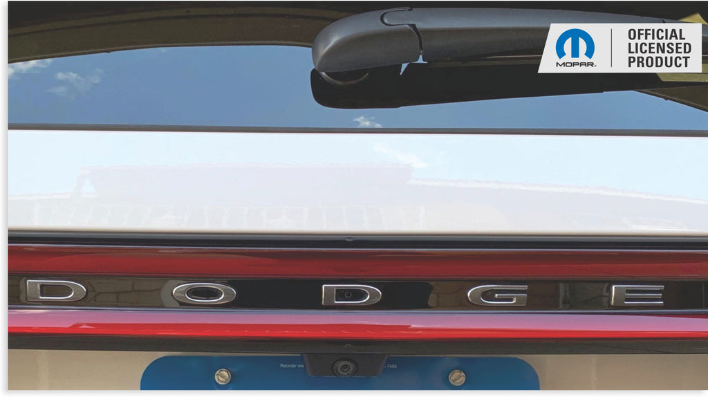 Vinyl decal designed to overlay the front face of the existing, factory DODGE emblem on the trunk lid between the tail lights. The chrome edges will remain exposed.