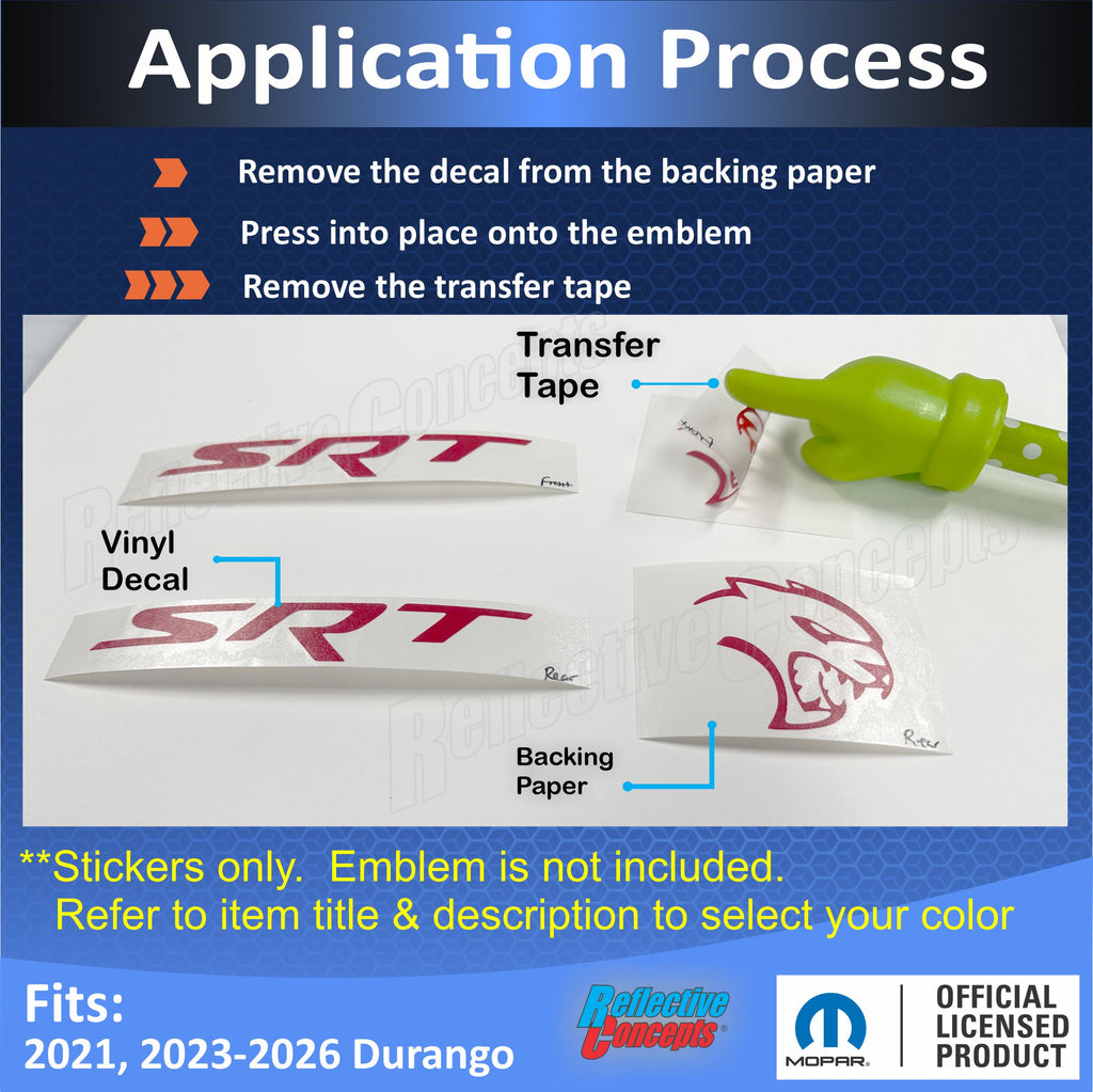 Vinyl decal designed to stick onto the front face of the SRT and the Hellcat existing factory emblems. The edges (chrome or black) will remain exposed.