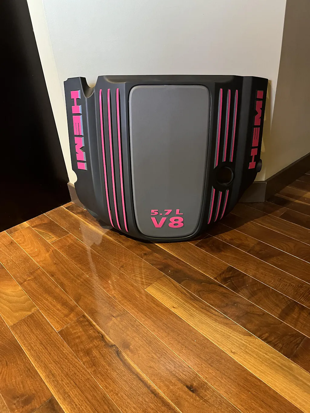 Vinyl decals designed to overlay the ridges on the sides of the factory engine cover.
