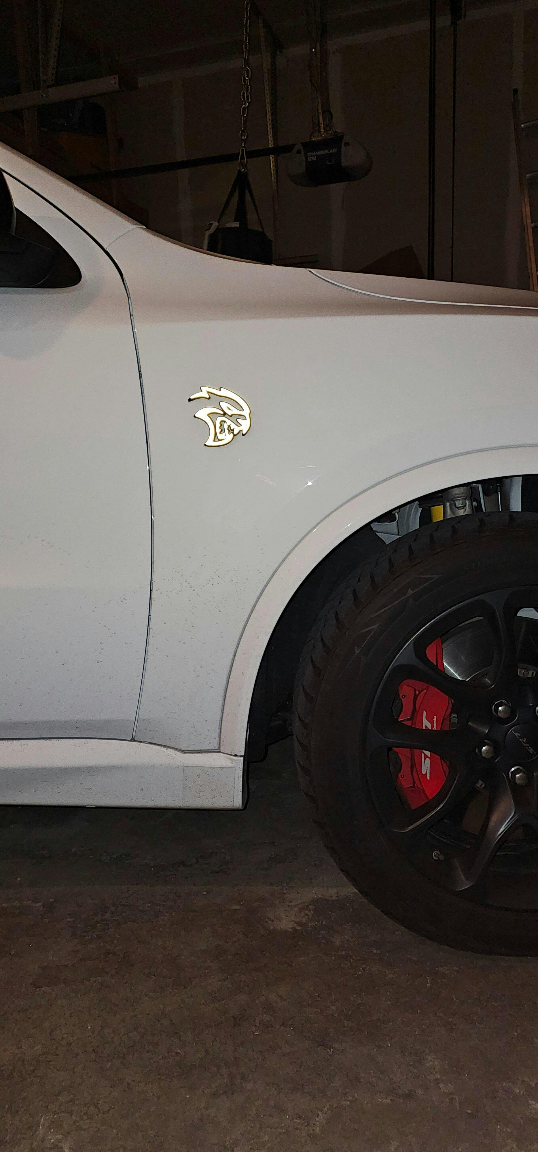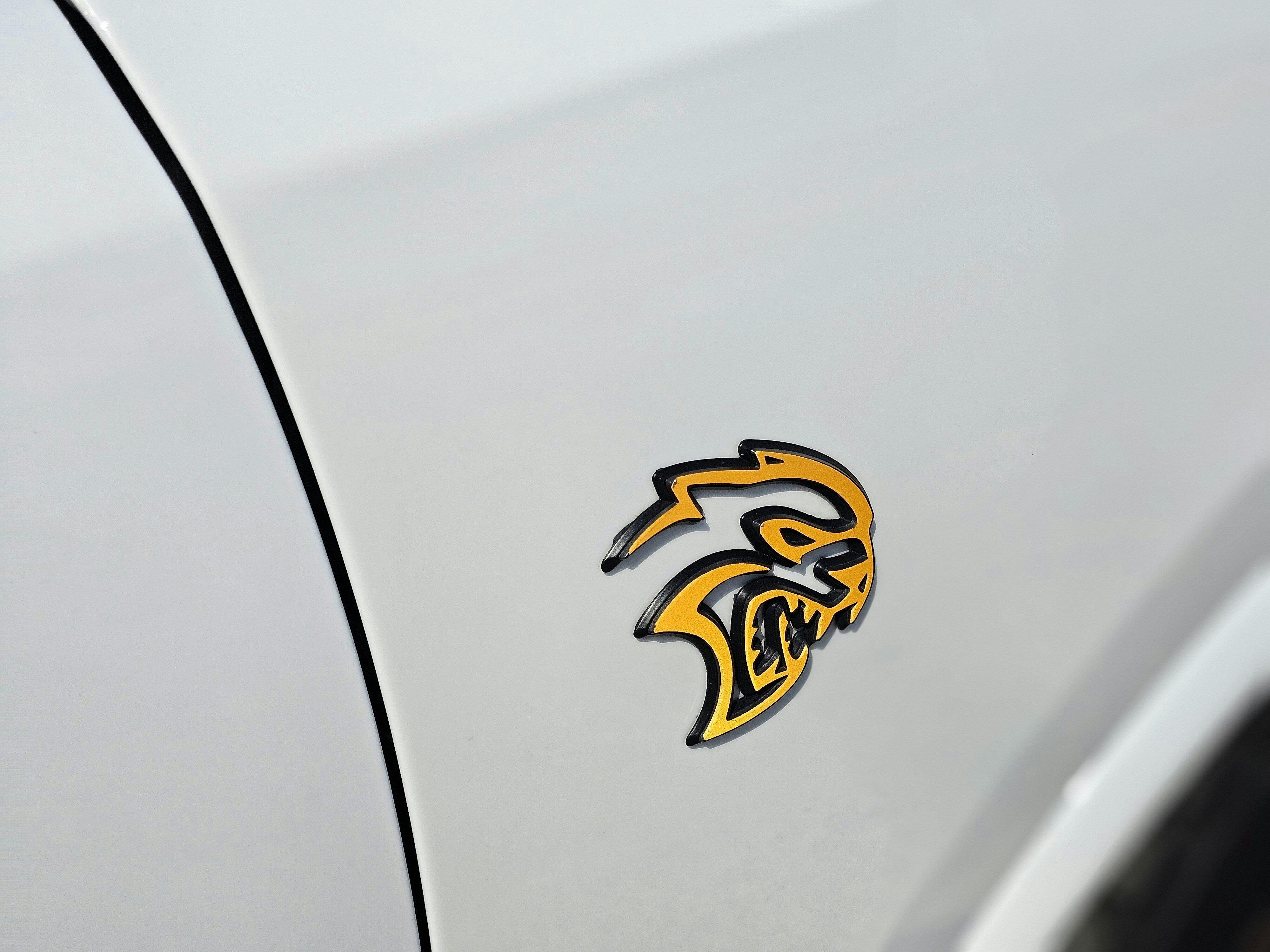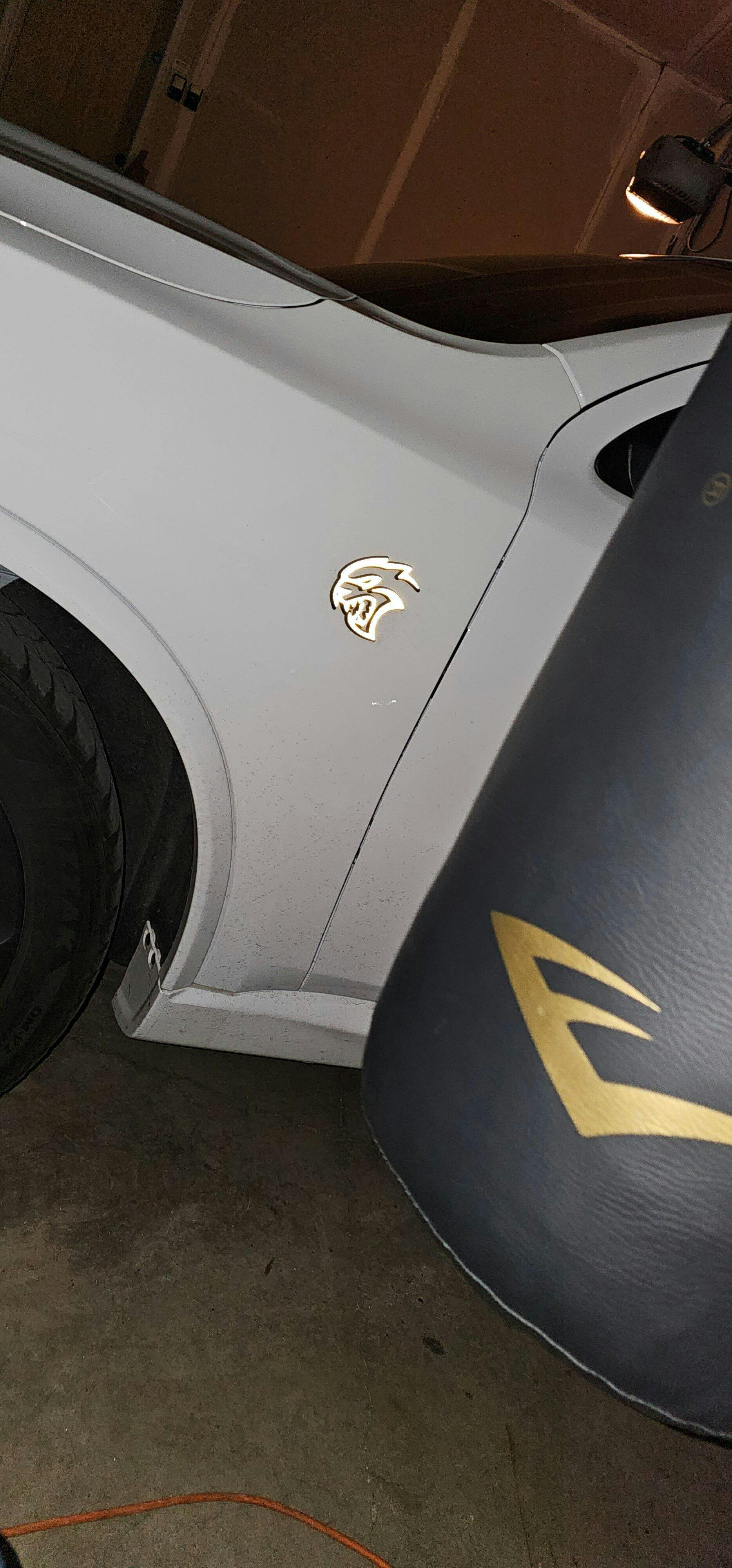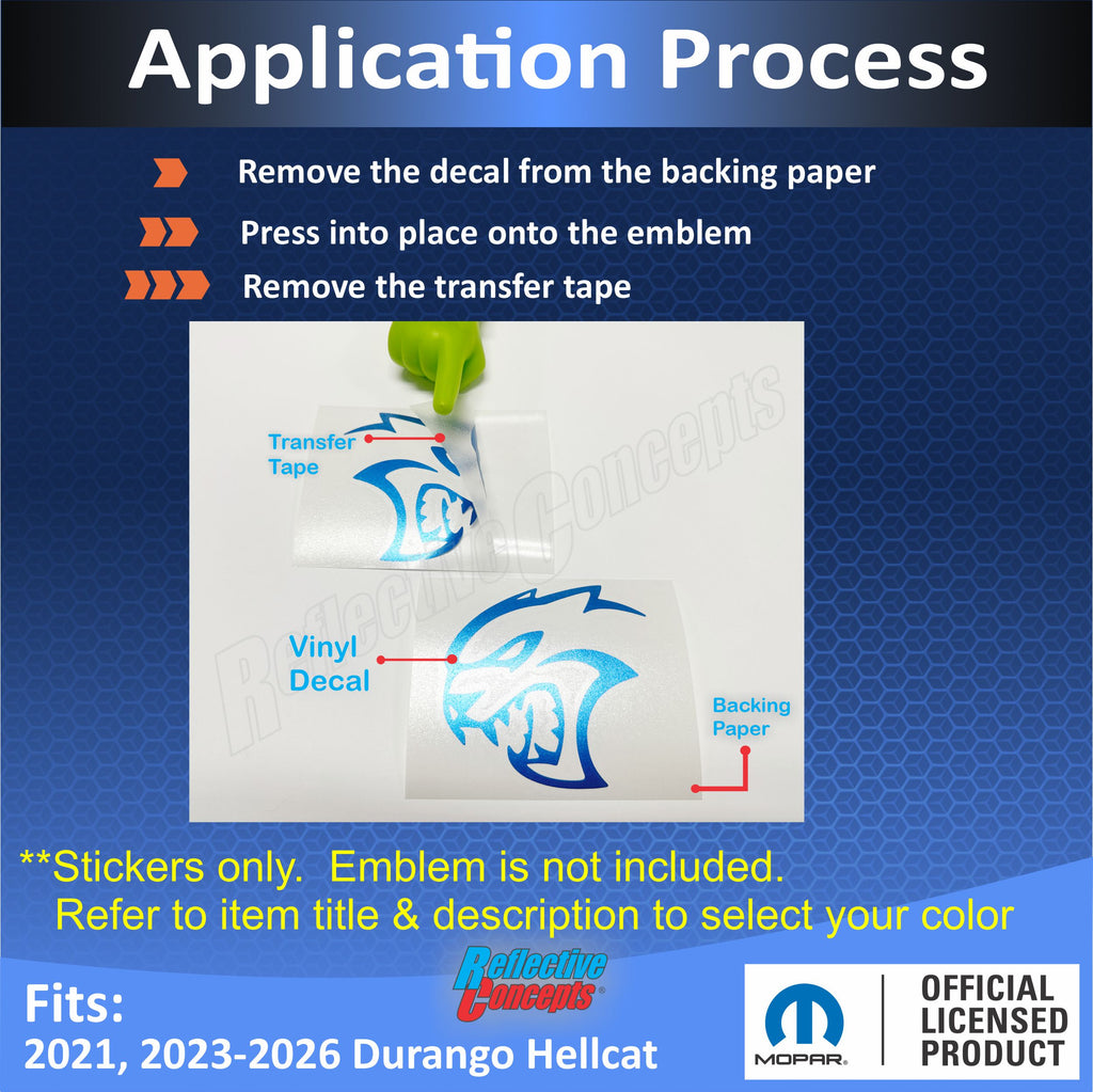 Vinyl decal designed to overlay the front face of the factory Hellcat fender emblems. The outer edge remains exposed/as-is.