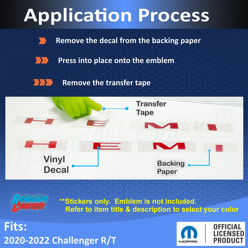 Vinyl decal designed to overlay the face of the existing, factory HEMI fender emblems. The outer edges of the emblem will remain exposed.