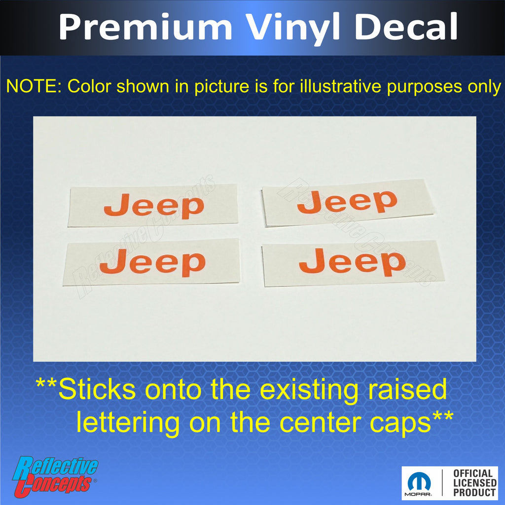 Vinyl decal designed to overlay the raised Jeep lettering on the factory center caps.