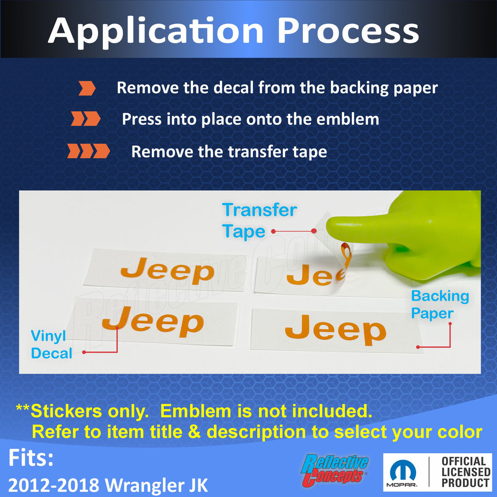 Vinyl decal designed to overlay the raised Jeep lettering on the factory center caps.