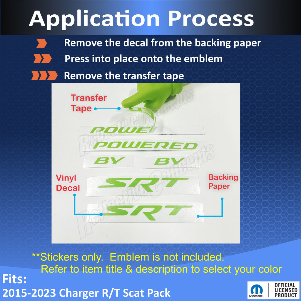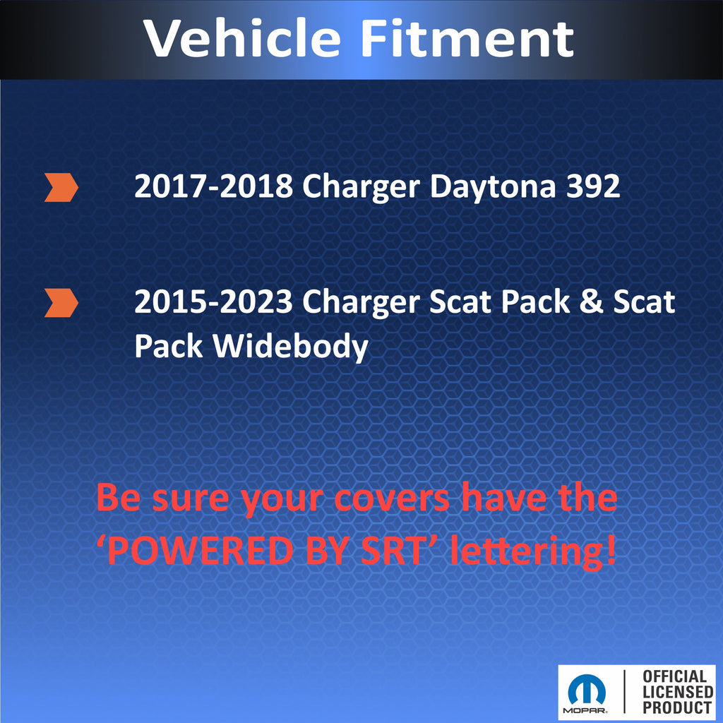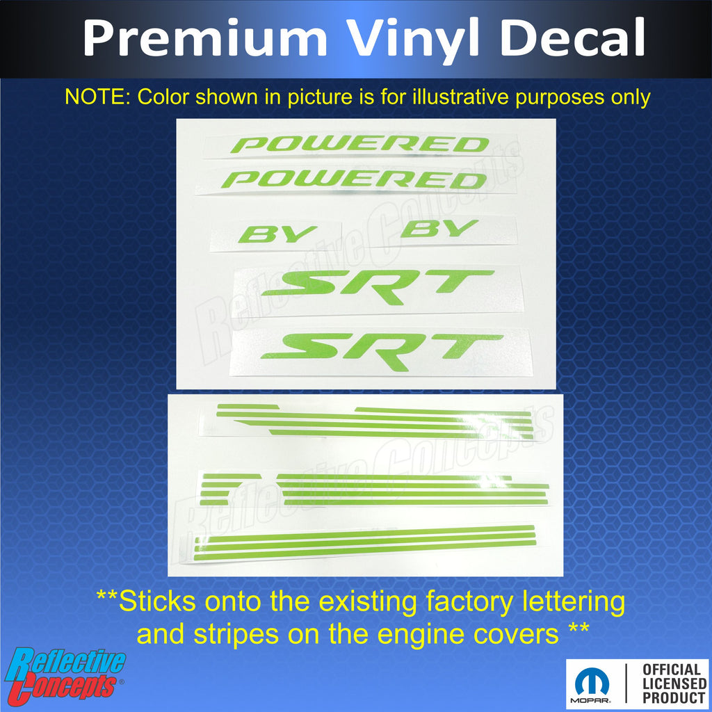 Vinyl decals sized and designed to fit over the POWERED BY SRT lettering and the Stripes embossed on the factory half covers.