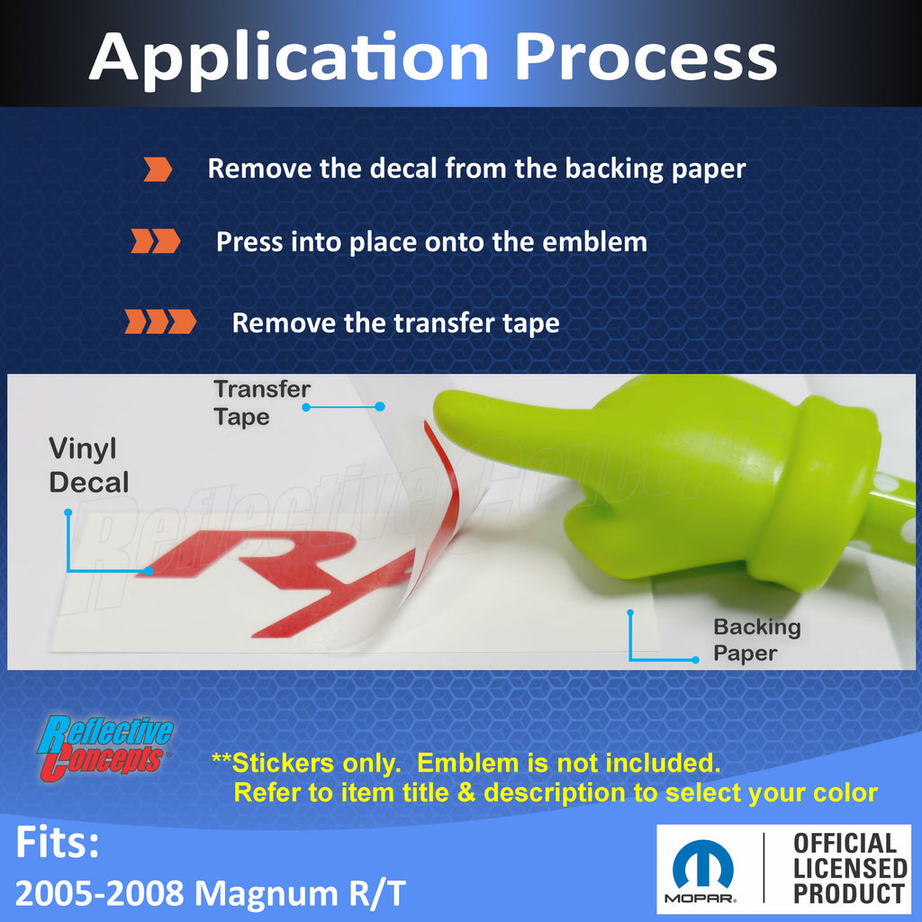 Vinyl decal designed to overlay the front face of the existing, factory R/T emblem on the trunk. The chrome edges will remain exposed.