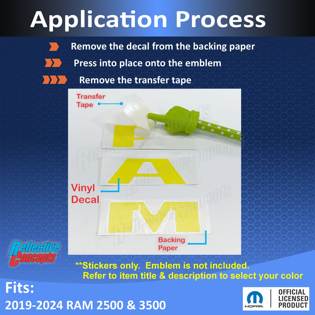 Vinyl decal designed to to be applied to the front face of the factory RAM letters on the grille.