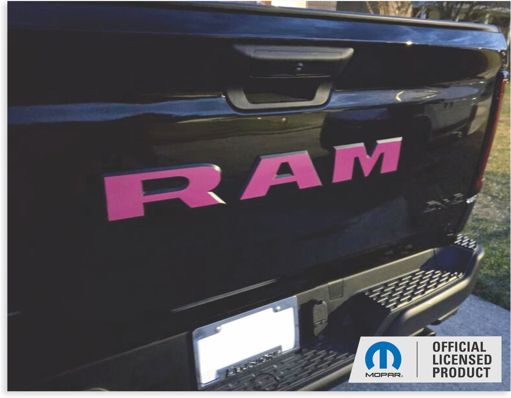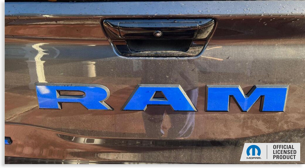 Vinyl decal designed to to be applied to the front face of the factory RAM letters on the tailgate.