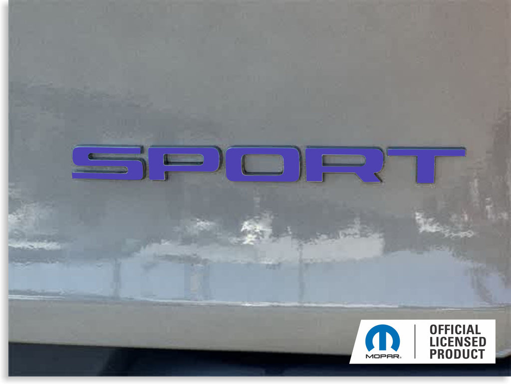 Vinyl decal (sticker) sized and designed to overlay the top flat section of the existing, factory SPORT badge on the lift gate. The chrome trim around the edge remains exposed.