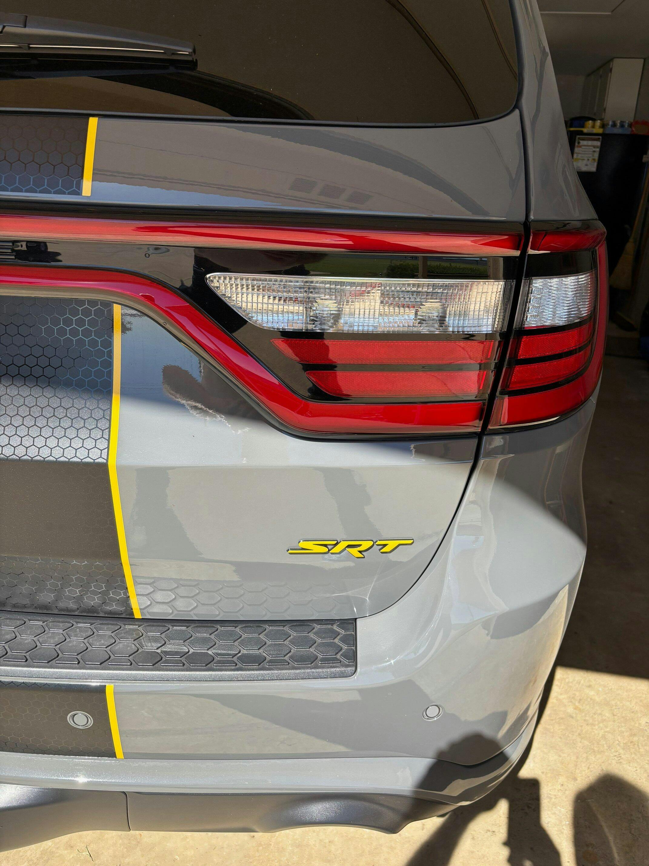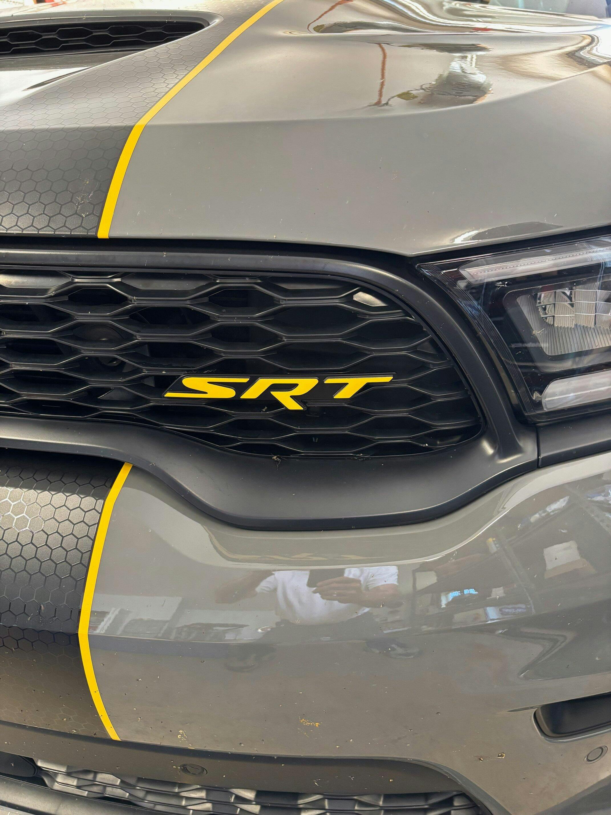 Vinyl decal designed to overlay the front face of the existing, factory SRT emblem on the grille and/or lift gate.