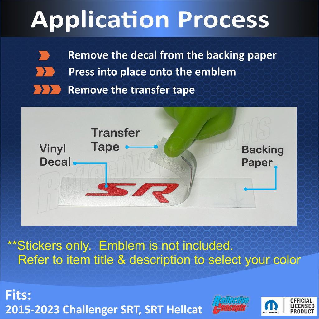 Vinyl decal sized and designed to stick onto the front face of the chrome SRT lettering on the steering wheel.