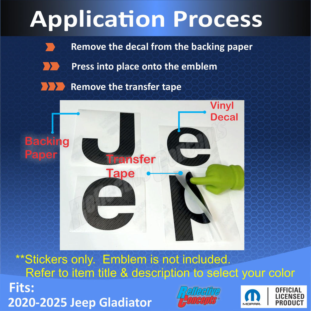Vinyl decals sized and designed to overlay the flat front face of the JEEP emblem on the tailgate. The bevel around the edge remains exposed.